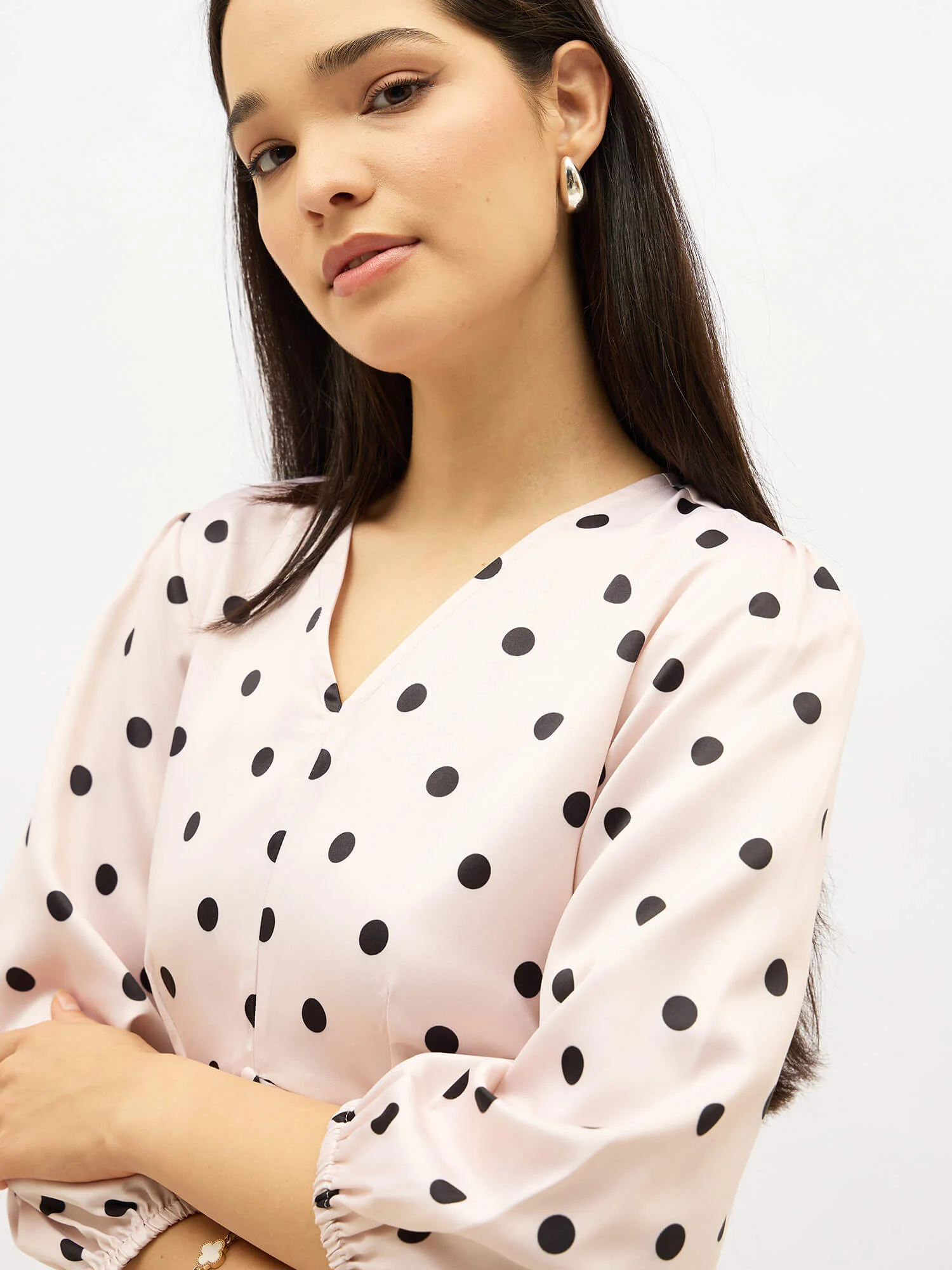 - An A-line, midi length dress in a polka print Features a V neckline