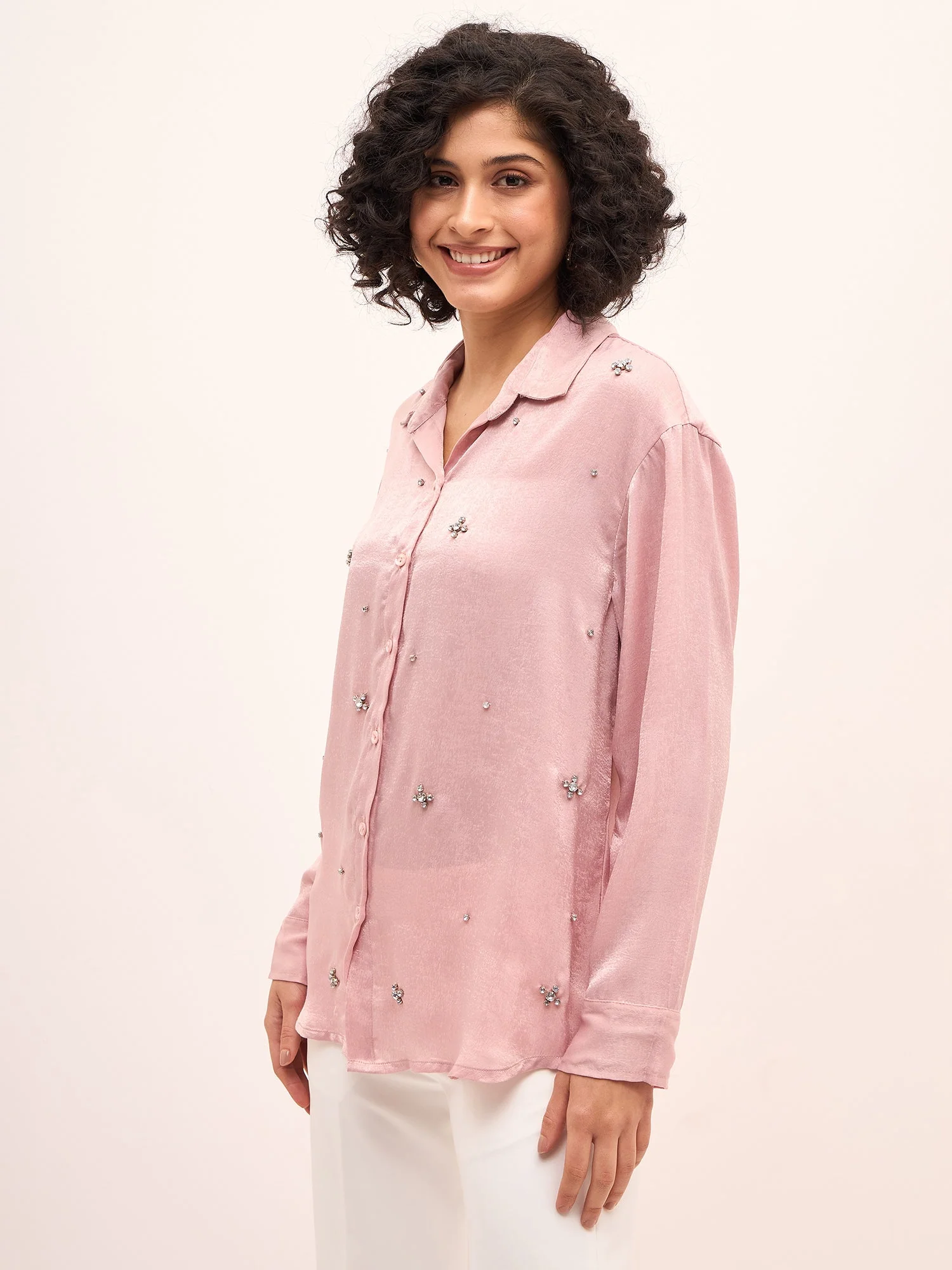 Champagne Night Embellished Button Down Shirt-Blush Pink