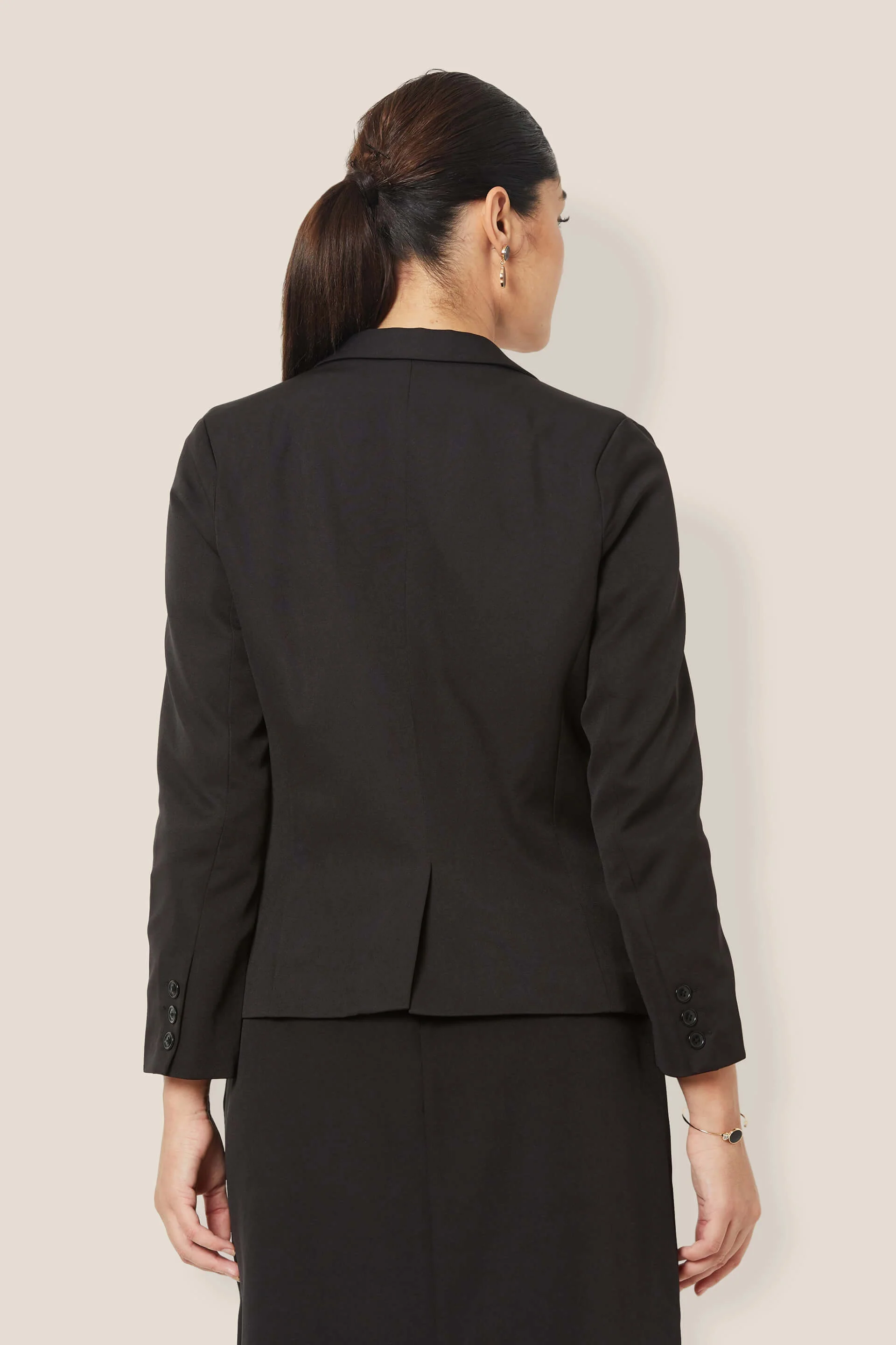 Single Breasted Fitted Blazer Notched Collar Single Button Closure in front Princess panels that shape the waist Full Sleeves with button details Fully lined Fabric is medium weight moss crepe Pair it with black bottoms or your dress for a formal look Color May Vary Slightly Due To Screen Settings