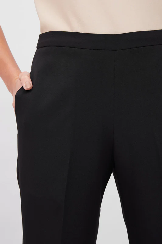 Straight fit pants in a black color. Features a side zip and a clean front. Done in Moss Lycra the fabric has a mild stretch, a good fall and gives a good fit. A must-have black pant, can be paired easily with multiple color tops. Top the pants off with a solid or printed blouse and match the look with a complementing blazer.