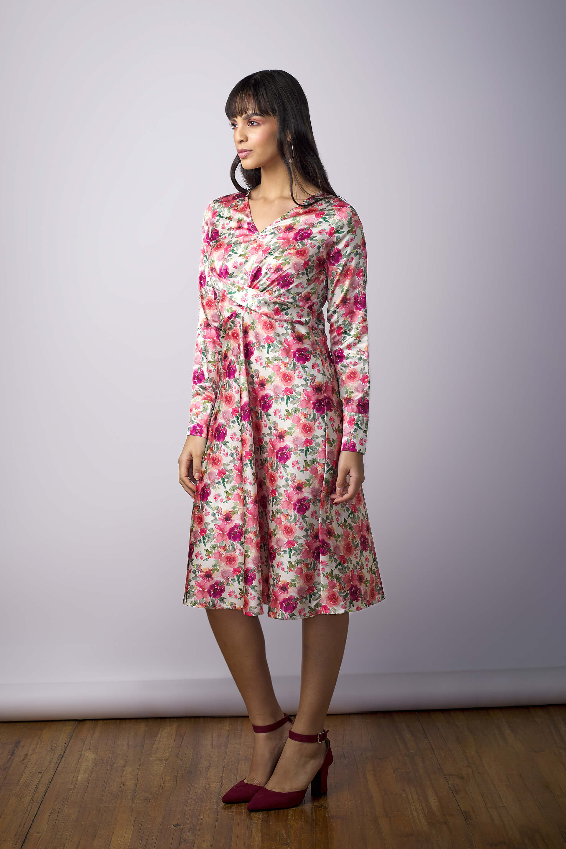 A modish, above-the-knee length, fit and flared dress in a vivacious floral print. Features a V neckline, draped detailing on the front, a side zip closure, and full-length cuffed sleeves. Crafted in satin to offer a fluid fall. Accessorize with a baguette bag and statement studs.