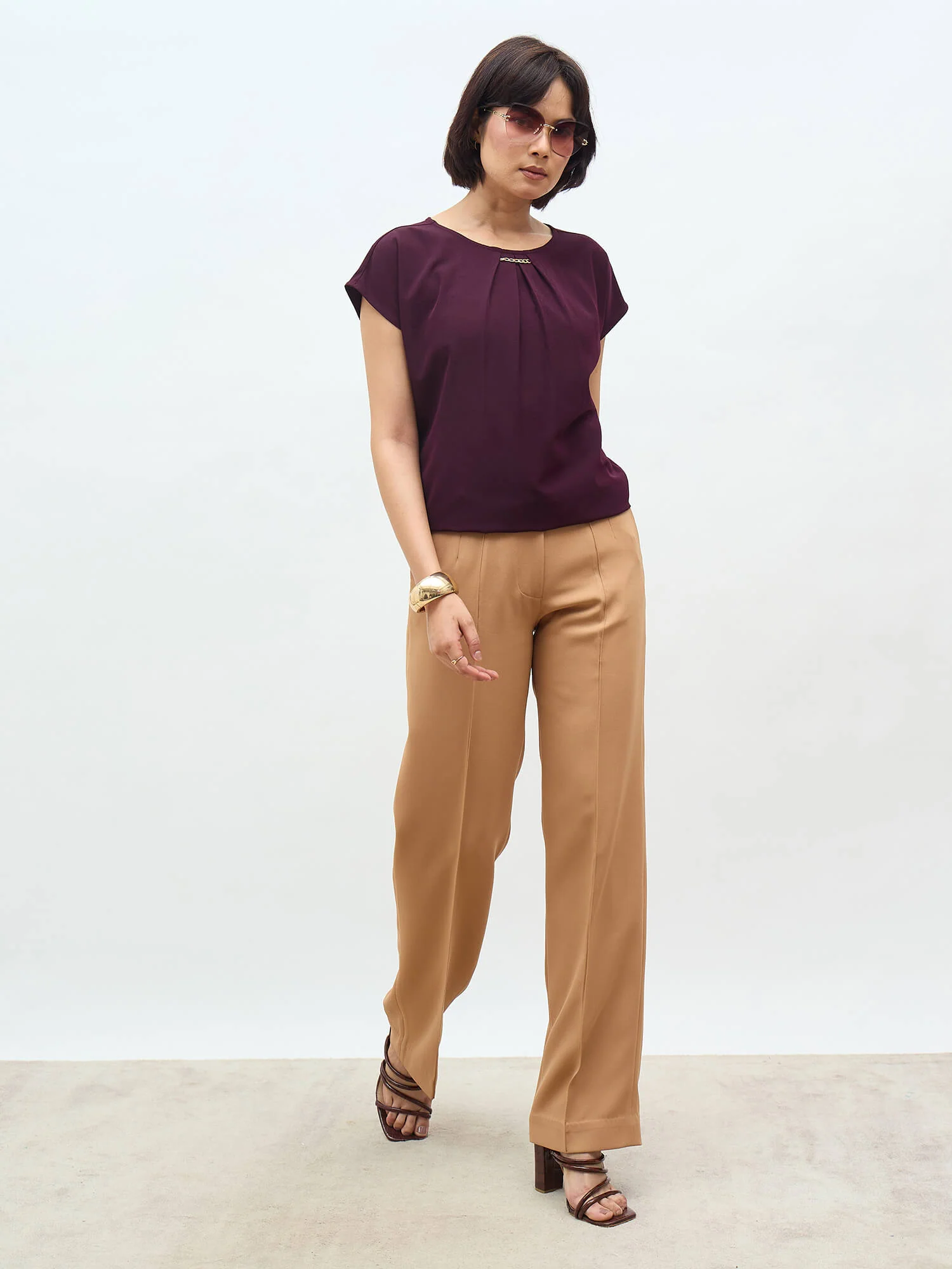 - Semi-formal solid top with elegant neck pleat detailing and metallic trim