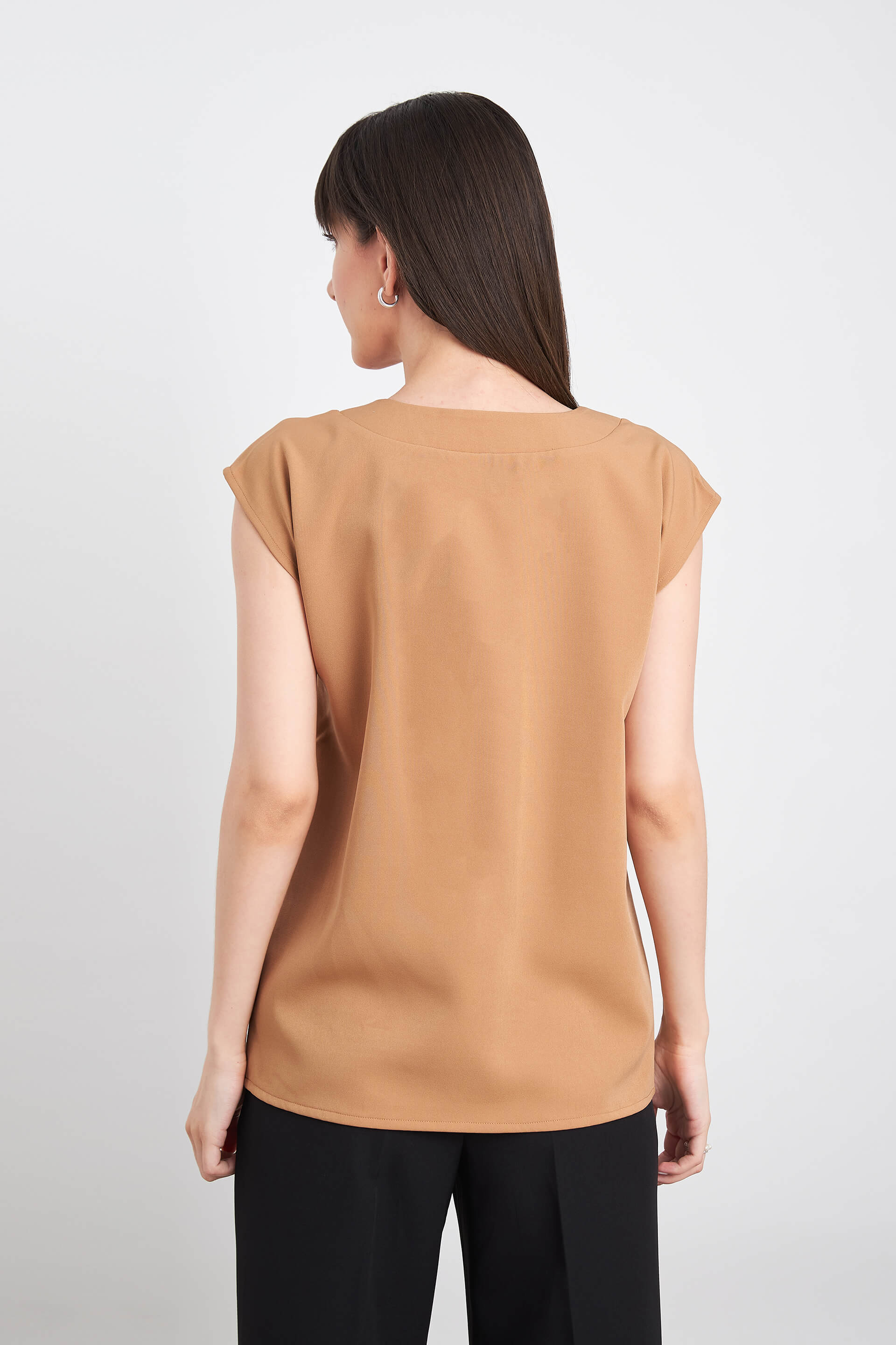 A contemporary, loosely tailored, sleeveless blouse in a soothing tan shade