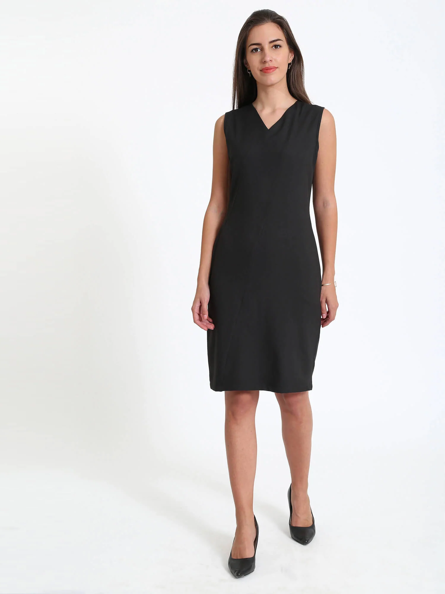 A must have for every wardrobe Sleeveless Black Dress with panels in front adds character to this simple yet elegant dress Pair it with a colored blazer for the boardroom and with minimal jewelry for the evening Standard lengths fit perfect for an average height of 5'2"-5'5"