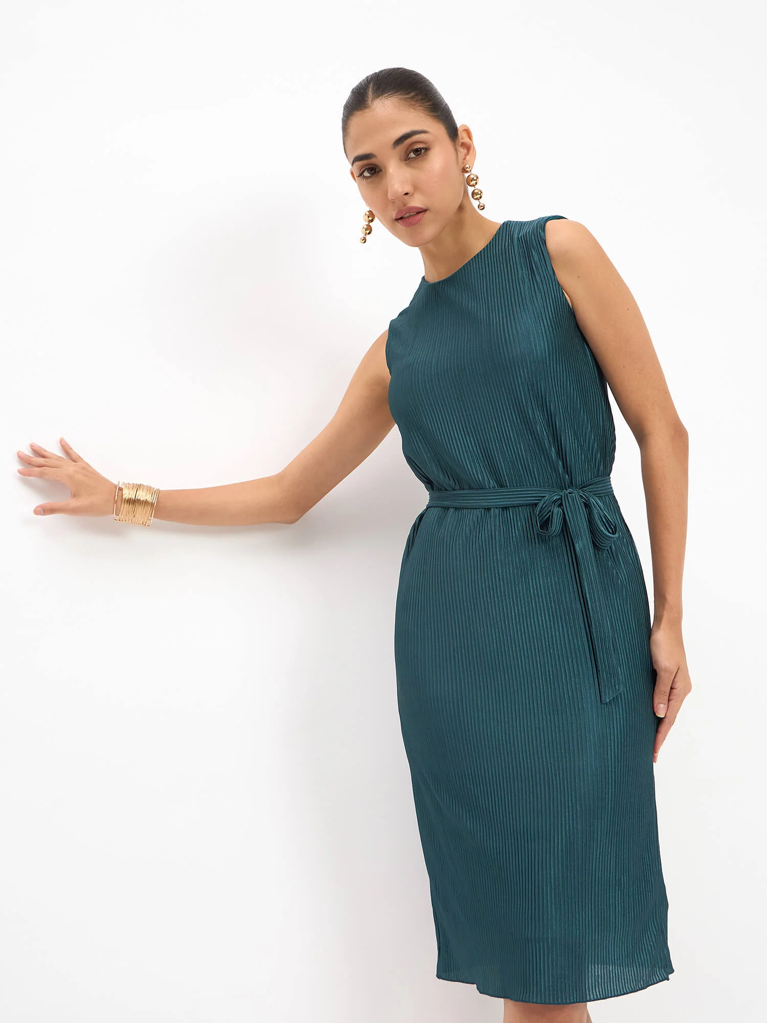 Teal Pleated Satin Shift Dress Understated Elegance