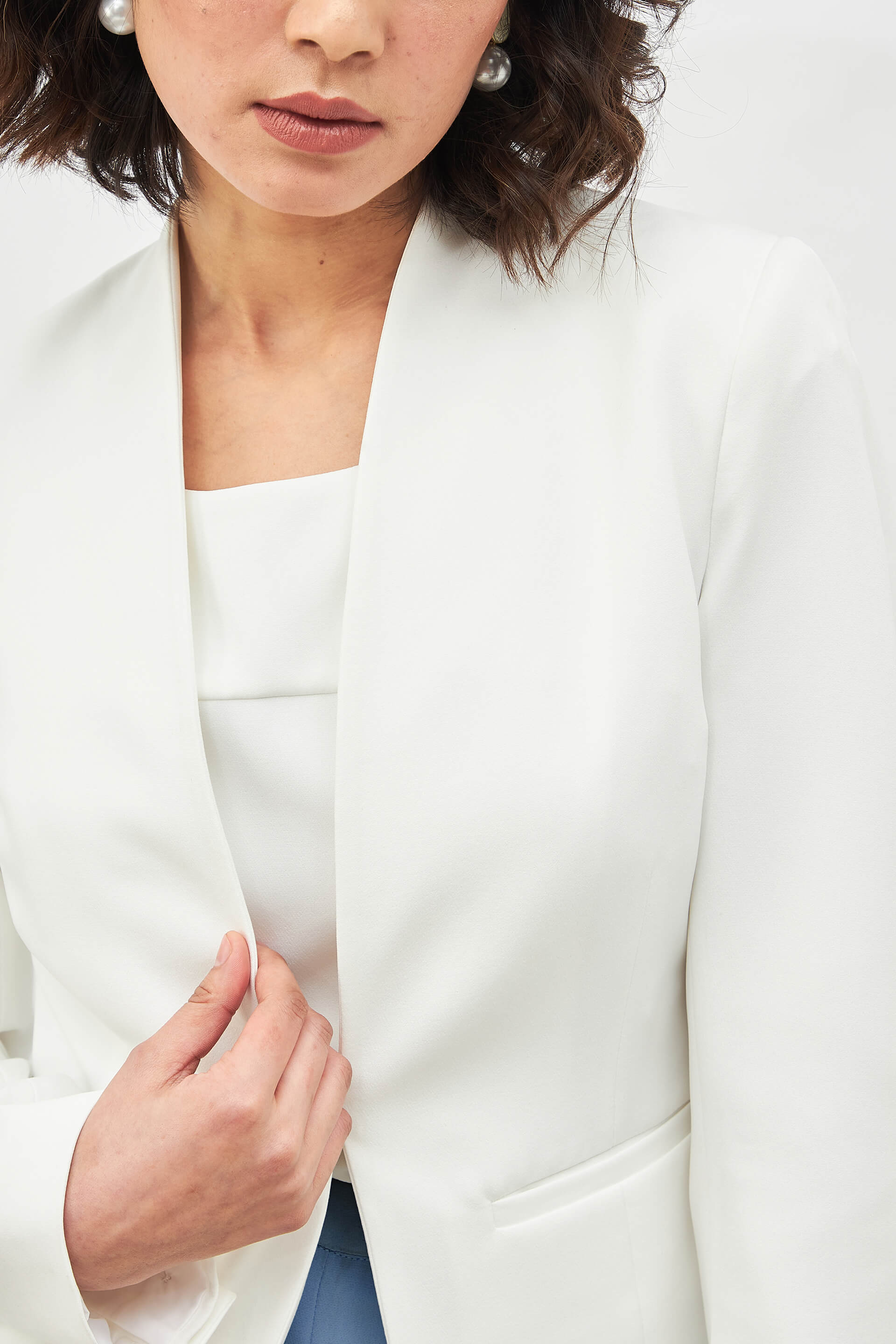An inventively tailored, lined, front open blazer in pearl white Features a clean neckline, besom pockets, a back vent, and full-length sleeves Crafted in moss lycra for an exquisite drape and durability Style it as a skirt suit for a refined appearance Accessorize with statement hoops